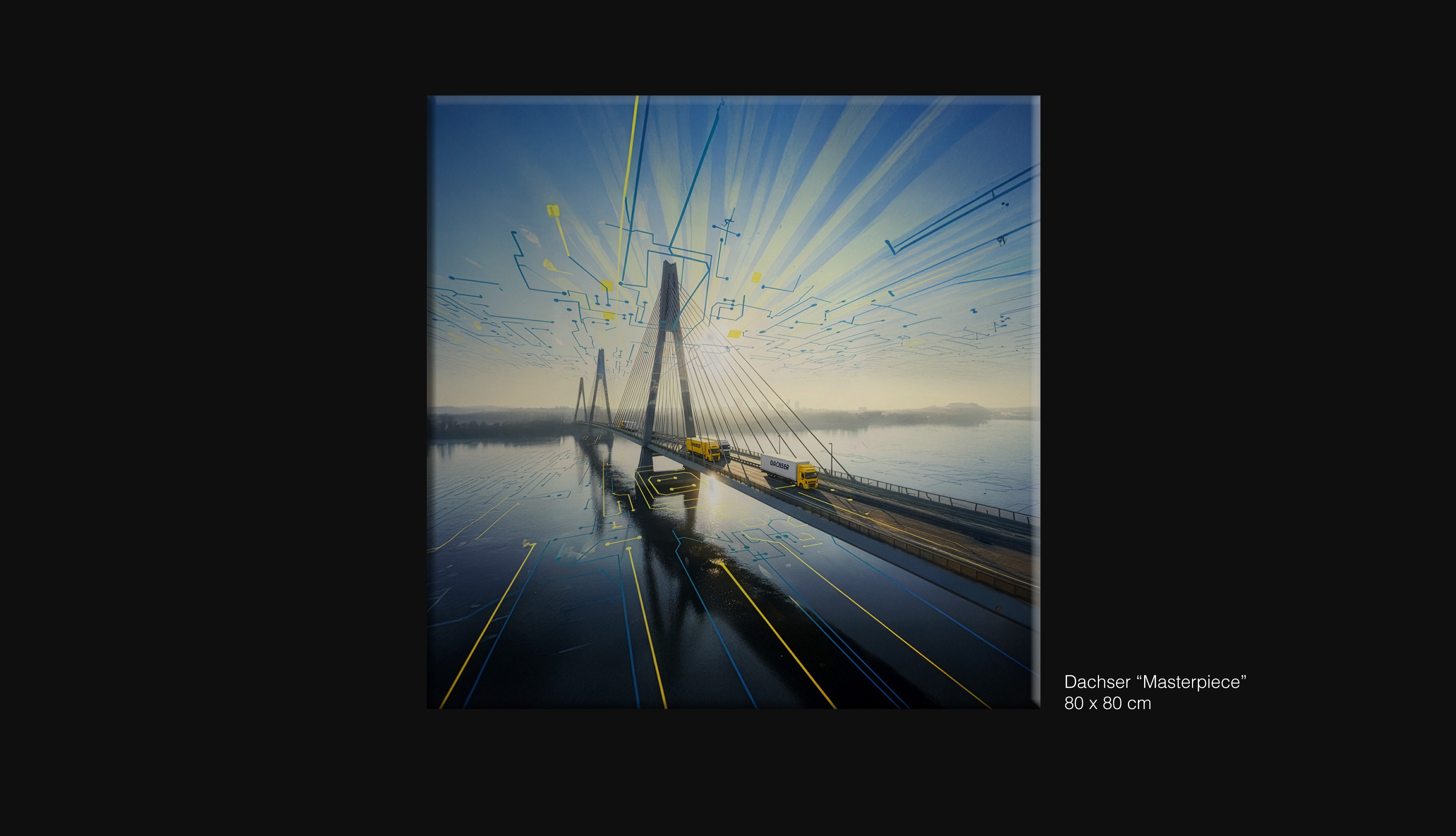 Für Dachser stand die globale Vernetzung und das Miteinander im Mittelpunkt. Die Bildwelten thematisieren Verbindung, Gemeinschaft und Bewegung, welches zentrale Werte sind, die das Unternehmen auszeichnen.Brückenelemente wurden zum visuellen Leitmotiv und symbolisieren den Austausch zwischen Menschen, Orten und Kulturen. Die Artworks wirken über die Räume hinweg und machen die Identität von Dachser vor Ort spürbar.
